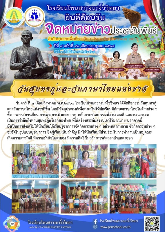 วันศุกร์ ที่ ๑ เดือนสิงหาคม พ.ศ.๒๕๖๘ โรงเรียนโพนสวางนางิ้ววิทยา ได้จัดกิจกรรมวันสุนทรภู่และวันภาษาไทยแห่งชาติขึ้น โดยมีวัตถุประสงค์เพื่อส่งเสริมให้นักเรียนมีทักษะภาษาไทยในด้านต่าง ๆ ทั้งการอ่าน การเขียน การพูด การฟังและการดู หลักภาษาไทย รวมทั้งวรรณคดี และวรรณกรรม เป็นการรำลึกถึงท่านสุนทรภู่กวีเอกของไทย ที่ได้สร้างสรรค์ผลงานเอาไว้มากมาย นอกจากนี้ ยังเป็นการส่งเสริมให้นักเรียนได้เรียนรู้จากการจัดกิจกรรมต่าง ๆ อย่างหลากหลาย ซึ่งกิจกรรมต่าง ๆ จะจัดในรูปแบบบูรณาการ ยึดผู้เรียนเป็นสำคัญ ฝึกให้นักเรียนมีส่วนร่วมในการทำงานเป็นหมู่คณะ เกิดความสามัคคี มีความมั่นใจในตนเอง มีความคิดริเริ่มสร้างสรรค์และกล้าแสดงออก |