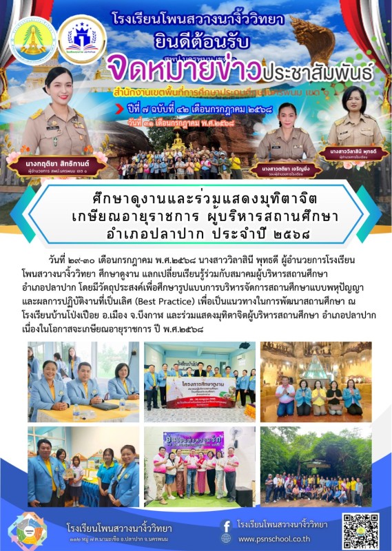 วันที่ ๒๙-๓๐ เดือนกรกฎาคม พ.ศ.๒๕๖๘ นางสาววิลาสินี พุทธดี ผู้อำนวยการโรงเรียนโพนสวางนางิ้ววิทยา ศึกษาดูงาน แลกเปลี่ยนเรียนรู้ร่วมกับสมาคมผู้บริหารสถานศึกษา อำเภอปลาปาก โดยมีวัตถุประสงค์เพื่อศึกษารูปแบบการบริหารจัดการสถานศึกษาแบบพหุปัญญา และผลการปฏิบัติงานที่เป็นเลิศ (Best Practice) เพื่อเป็นแนวทางในการพัฒนาสถานศึกษา ณ โรงเรียนบ้านโป่งเปือย อ.เมือง จ.บึงกาฬ และร่วมแสดงมุทิตาจิตผู้บริหารสถานศึกษา อำเภอปลาปาก เนื่องในโอกาสจะเกษียณอายุราชการ ปี พ.ศ.๒๕๖๘ |