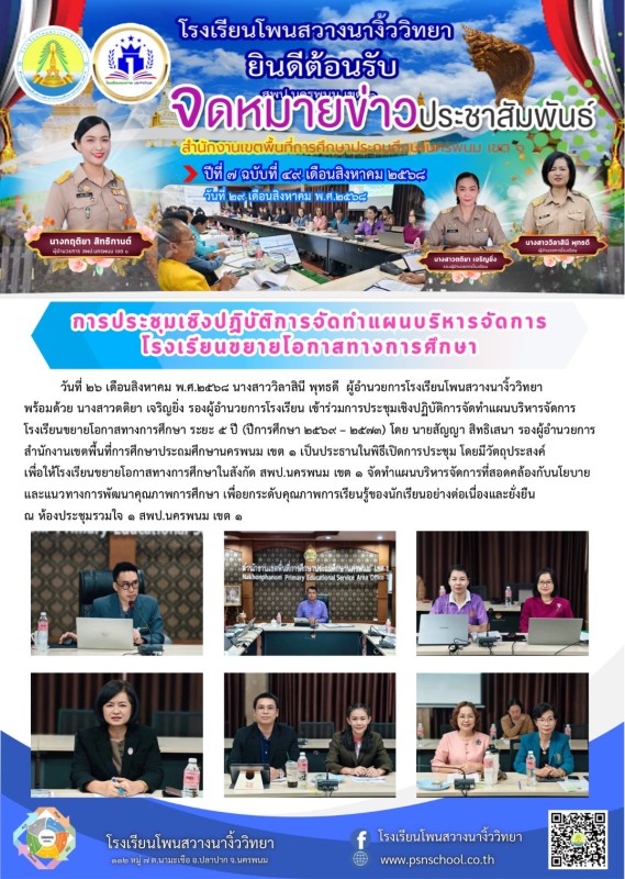 วันที่ ๒๖ เดือนสิงหาคม พ.ศ.๒๕๖๘ นางสาววิลาสินี พุทธดี ผู้อำนวยการโรงเรียนโพนสวางนางิ้ววิทยา พร้อมด้วย นางสาวตติยา เจริญยิ่ง รองผู้อำนวยการโรงเรียน เข้าร่วมการประชุมเชิงปฏิบัติการจัดทำแผนบริหารจัดการโรงเรียนขยายโอกาสทางการศึกษา ระยะ ๕ ปี (ปีการศึกษา ๒๕๖๙ – ๒๕๗๓) โดย นายสัญญา สิทธิเสนา รองผู้อำนวยการสำนักงานเขตพื้นที่การศึกษาประถมศึกษานครพนม เขต ๑ เป็นประธานในพิธีเปิดการประชุม โดยมีวัตถุประสงค์ เพื่อให้โรงเรียนขยายโอกาสทางการศึกษาในสังกัด สพป.นครพนม เขต ๑ จัดทำแผนบริหารจัดการที่สอดคล้องกับนโยบายและแนวทางการพัฒนาคุณภาพการศึกษา เพื่อยกระดับคุณภาพการเรียนรู้ของนักเรียนอย่างต่อเนื่องและยั่งยืน ณ ห้องประชุมรวมใจ ๑ สพป.นครพนม เขต ๑ |
