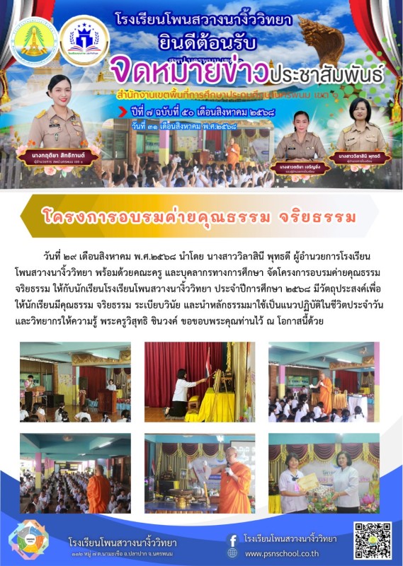 วันที่ ๒๙ เดือนสิงหาคม พ.ศ.๒๕๖๘ นำโดย นางสาววิลาสินี พุทธดี ผู้อำนวยการโรงเรียนโพนสวางนางิ้ววิทยา พร้อมด้วยคณะครู และบุคลากรทางการศึกษา จัดโครงการอบรมค่ายคุณธรรม จริยธรรม ให้กับนักเรียนโรงเรียนโพนสวางนางิ้ววิทยา ประจำปีการศึกษา ๒๕๖๘ มีวัตถุประสงค์เพื่อให้นักเรียนมีคุณธรรม จริยธรรม ระเบียบวินัย และนำหลักธรรมมาใช้เป็นแนวปฏิบัติในชีวิตประจำวันและวิทยากรให้ความรู้ พระครูวิสุทธิ ชินวงค์ ขอขอบพระคุณท่านไว้ ณ โอกาสนี้ด้วย |